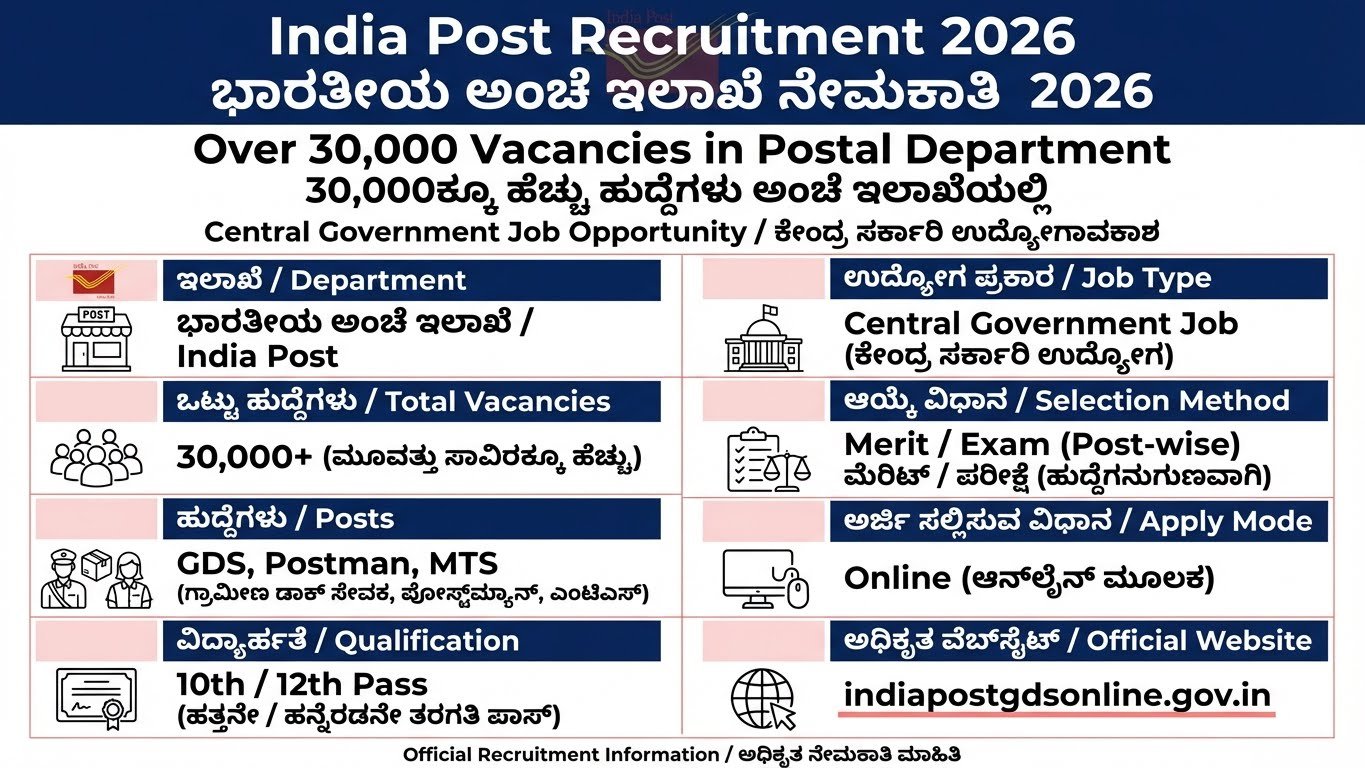 India Post Recruitment 2026: ಅಂಚೆ ಇಲಾಖೆಯಲ್ಲಿ 30,000ಕ್ಕೂ ಹೆಚ್ಚು ಹುದ್ದೆಗಳ ಭರ್ತಿ – ಸಂಪೂರ್ಣ ಮಾಹಿತಿ